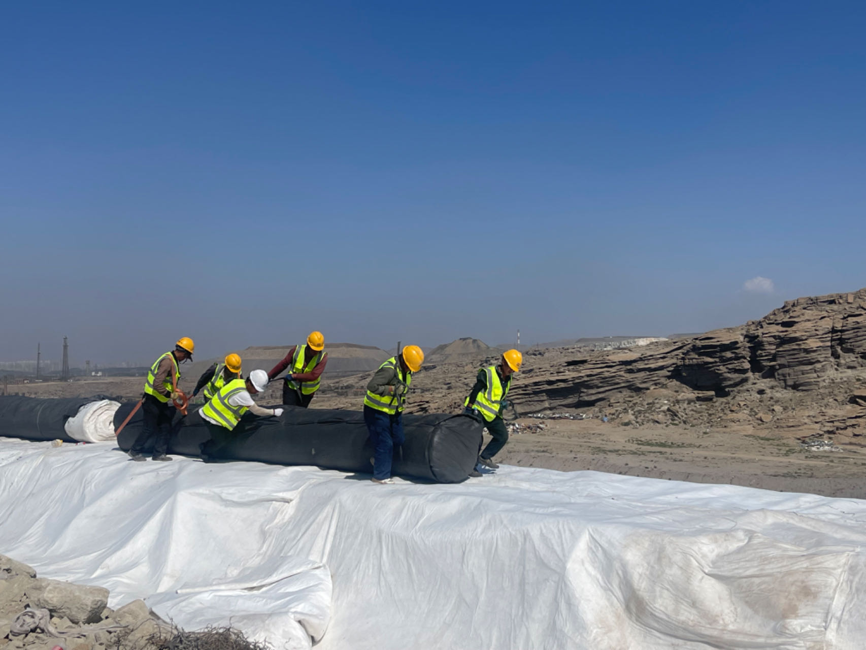 秋更深了,風沙席卷中,烏海垃圾處理新建工程項目部緊繃“安全弦”,以“時不我與,時不我待”的精神拉滿施工“進度條”,迎來垃圾消納場最為關鍵的工序——鋪設地下防滲層。“大家使勁,再加把勁!”施工現場,數十名施工人員站成一排,正擼起袖子推動著一大卷黑膜向前行。他們個個頭戴安全帽,身穿反光背心,衣服都已被汗水打濕,雙肩和領口處結滿了汗水蒸發后留下的白色鹽霜。